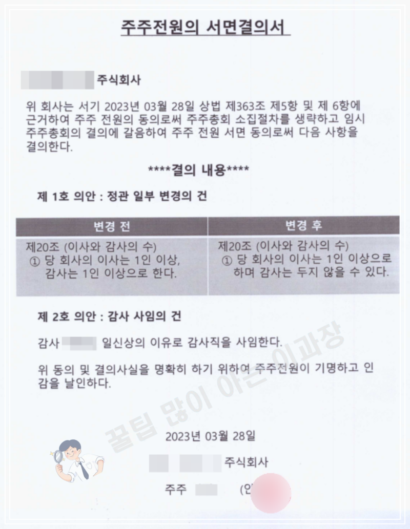 2. 주주 전원의 서면결의서 : 정관 변경 전/후 내용을 결의하고 주주 개인 인감을 날인합니다.첨부 양식을 수정하여 사용하면 됩니다.